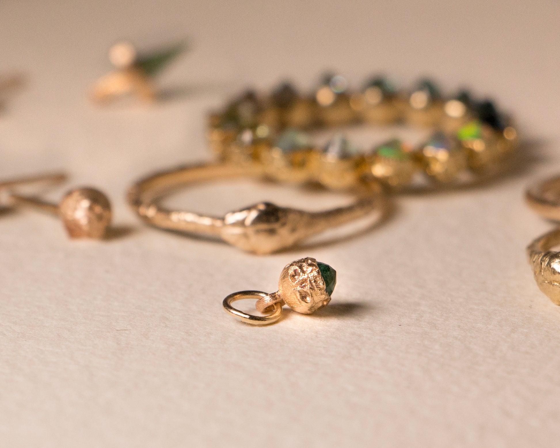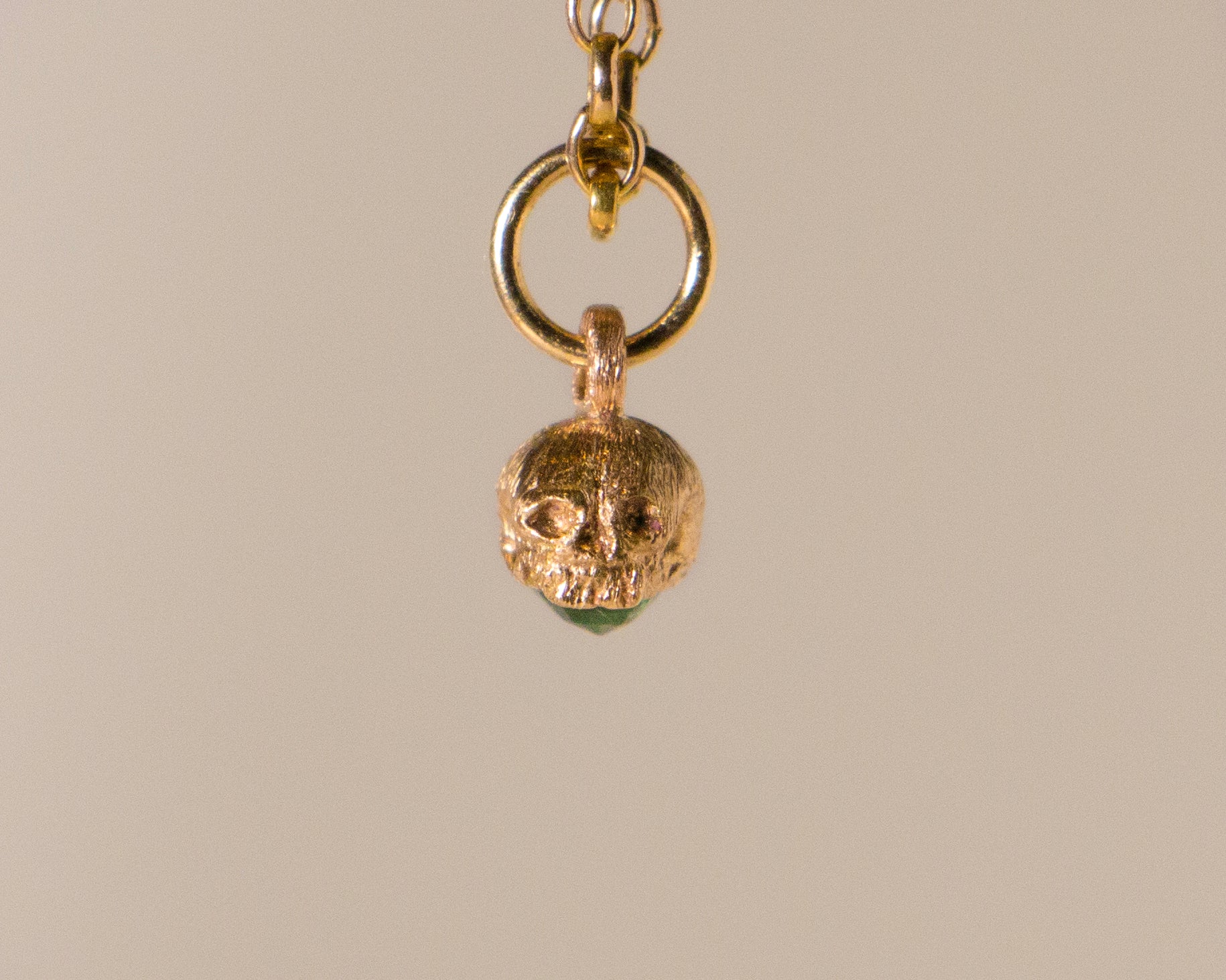 A small hand-carved skull is cast in rich gold and perched atop a radiant gemstone.