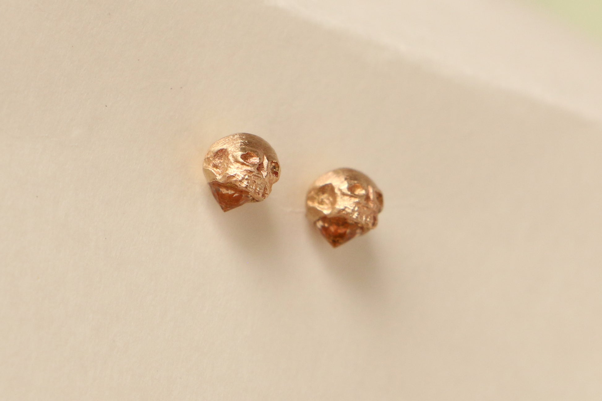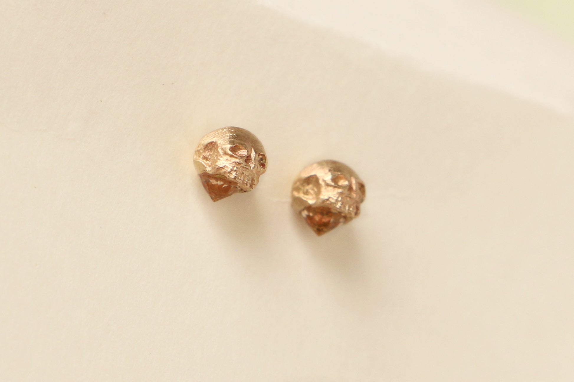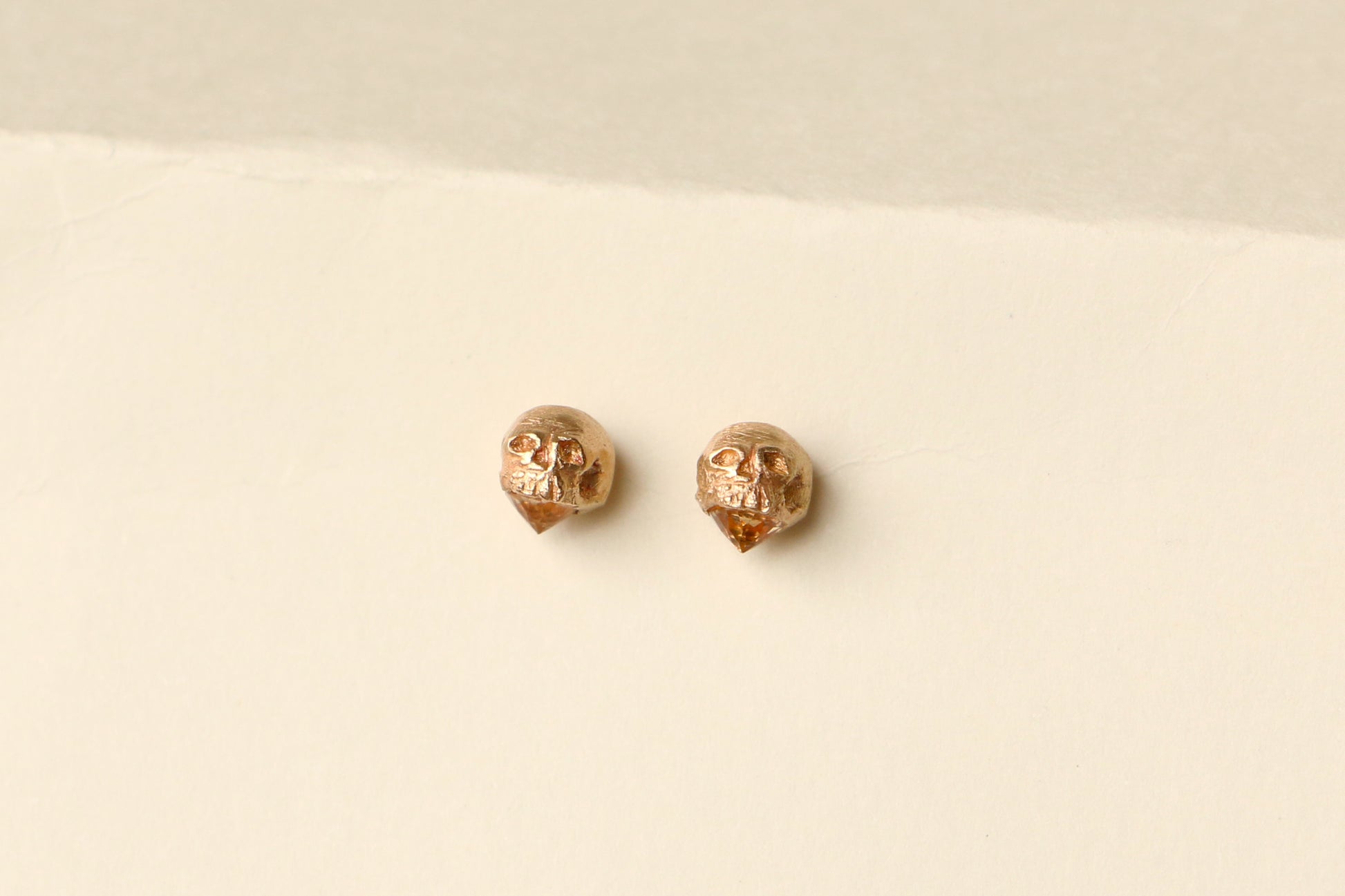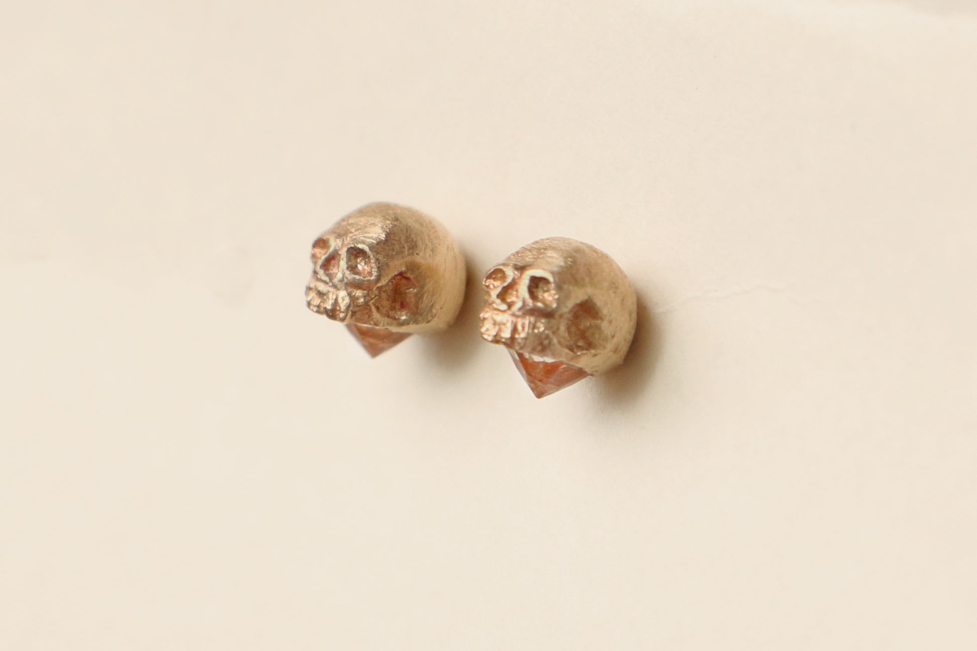 A small hand-carved skull is cast in rich gold and perched atop a radiant gemstone.