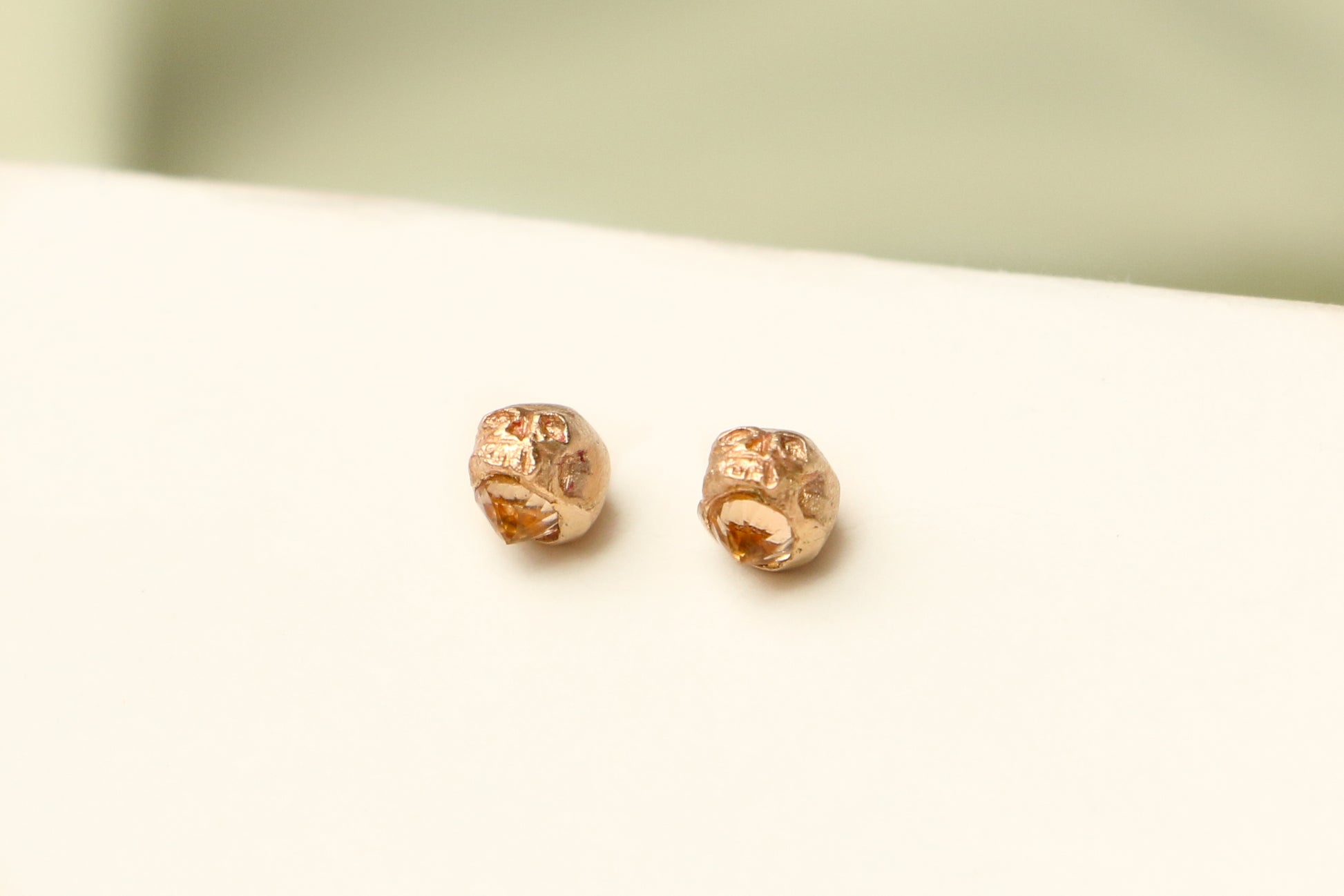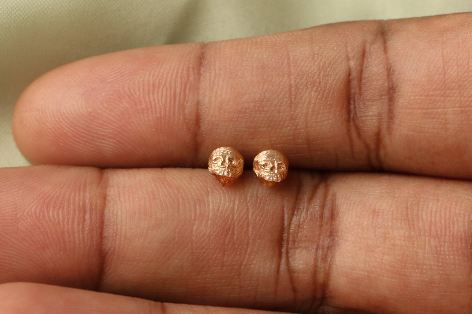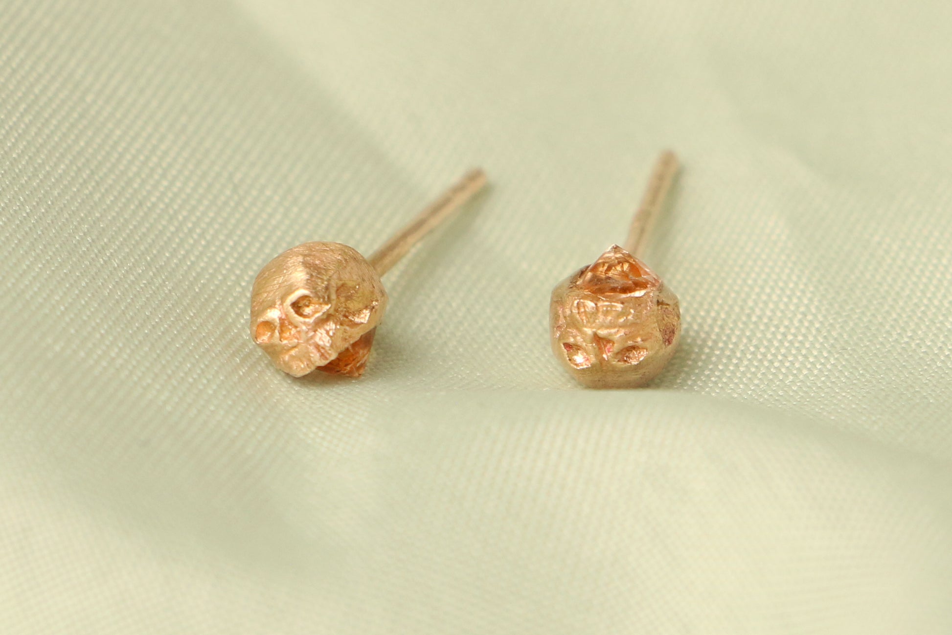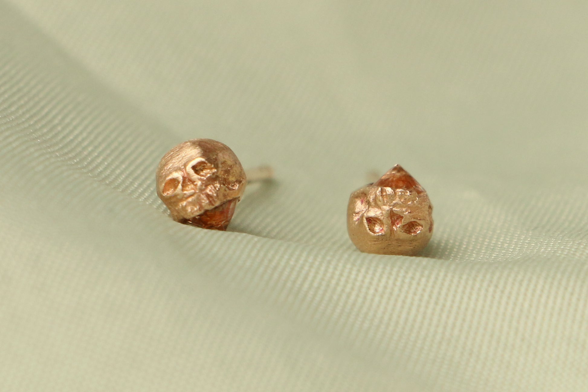 A small hand-carved skull is cast in rich gold and perched atop a radiant gemstone.