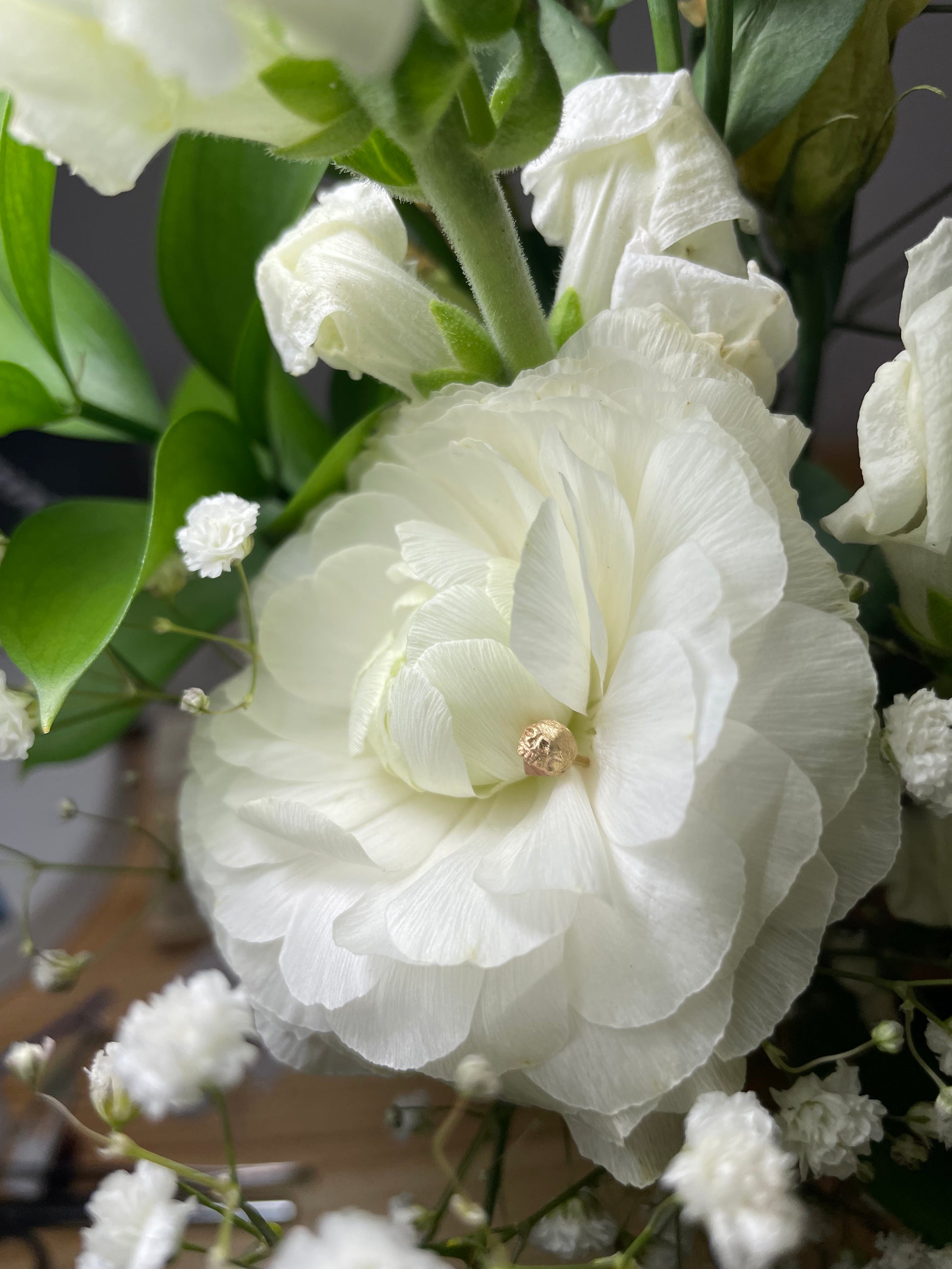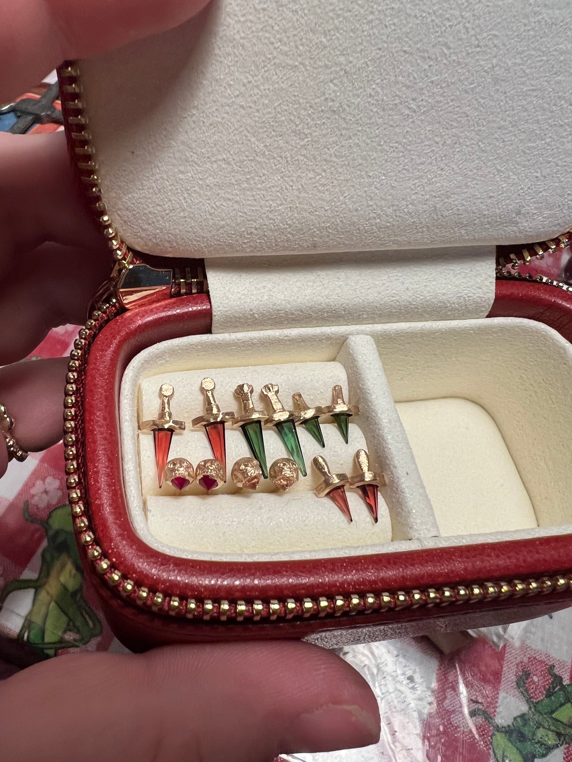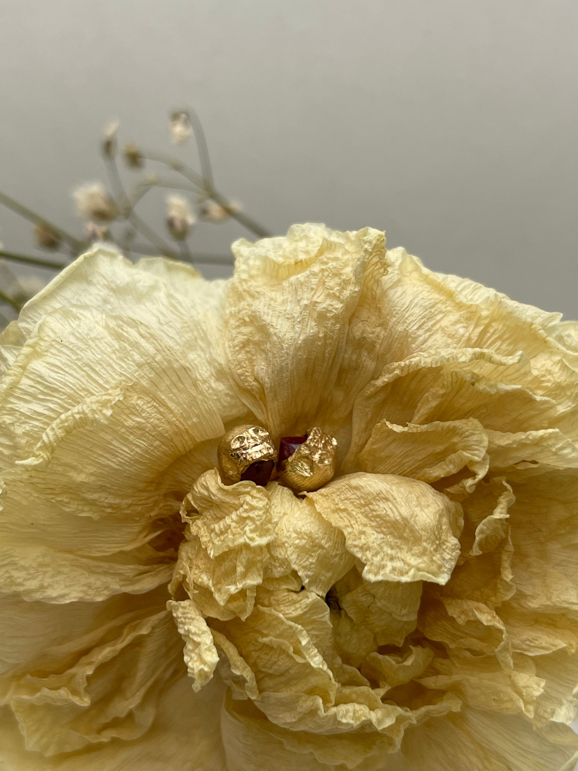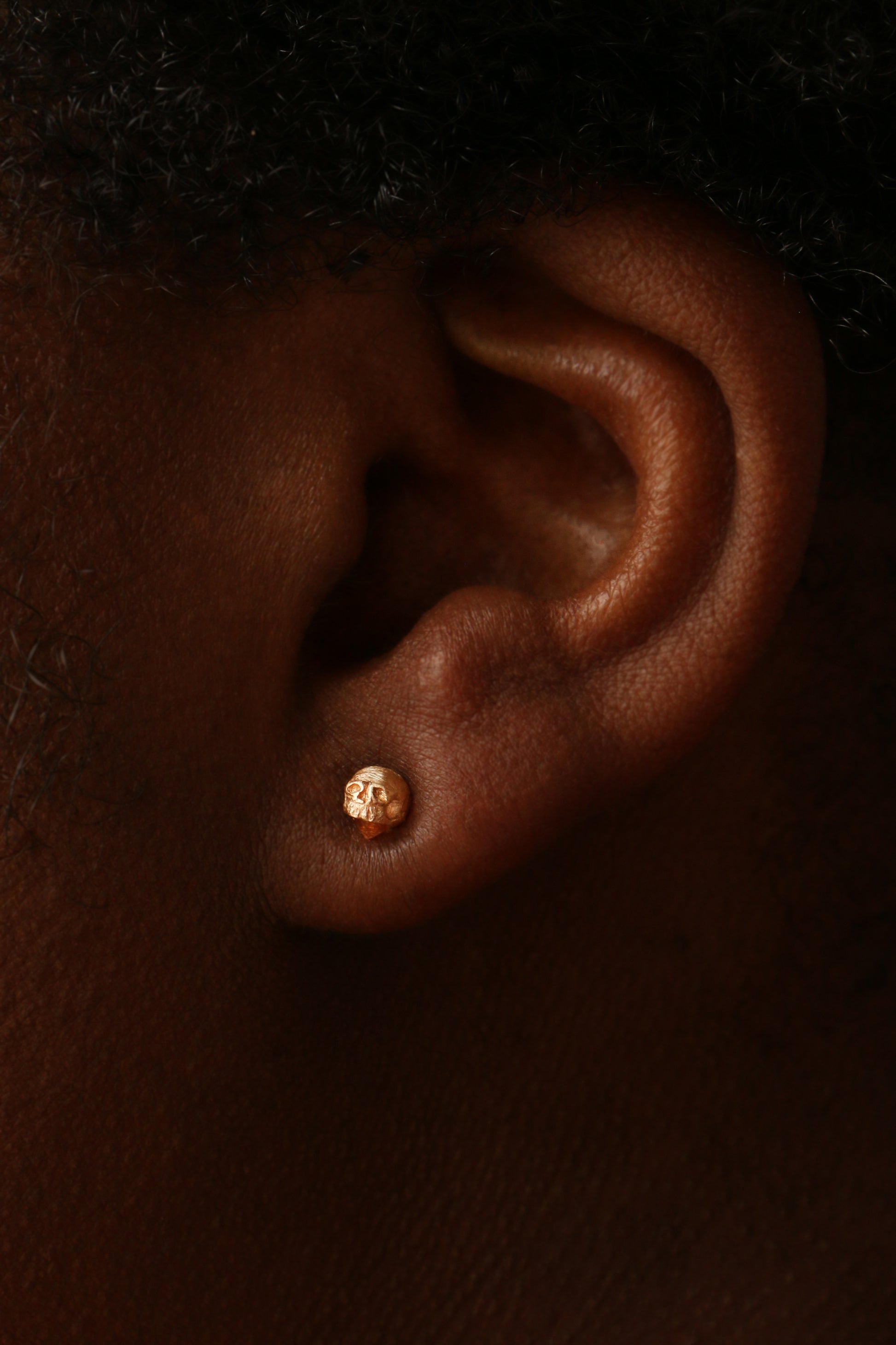 A small hand-carved skull is cast in rich gold and perched atop a radiant gemstone.